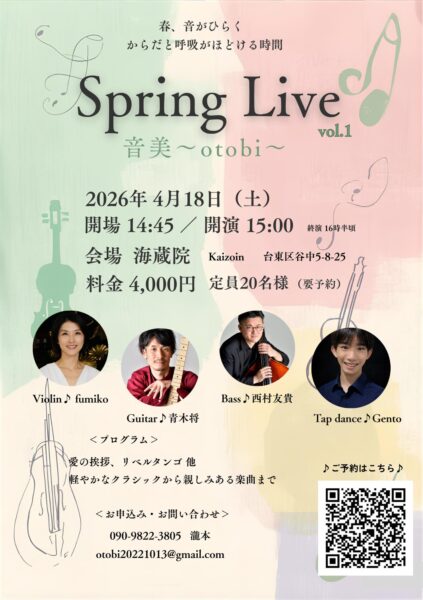 谷中にあるお寺『海蔵院』にて、2026年4月18日(土)開場 14:45 / 開演 15:00(終演予定 16時半頃)